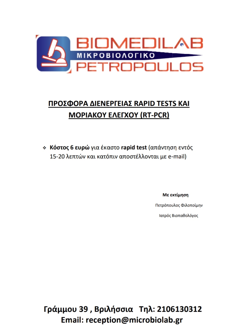 Προσφορά διενέργειας rapid test και μοριακού ελέγχου Προσφορά διενέργειας rapid test και μοριακού ελέγχου fΚοινοποίηση Tweet