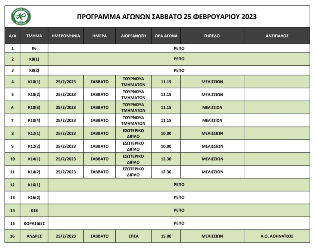 Πρόγραμμα αγώνων 25/2/2023