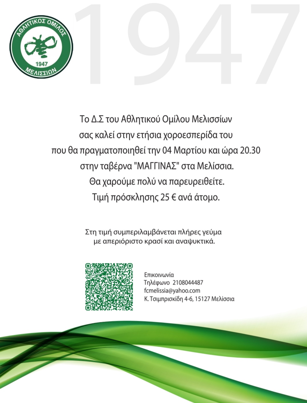 Ετήσια χορεσπερίδα Ετήσια χορεσπερίδα Υπεύθυνοι διάθεσης προσκλήσεων: 1) Μαδακη Δέσποινα Τηλ. 6972374166 2) Κοντούρη Σοφια Τηλ. 2108044487 fΚοινοποίηση Tweet