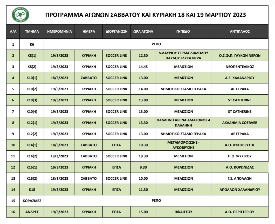 Πρόγραμμα αγώνων 18-19/3/2023