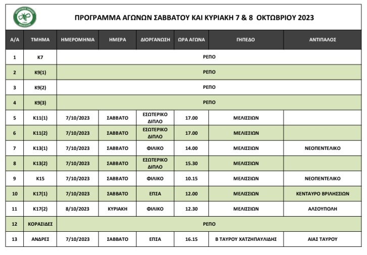 Πρόγραμμα αγώνων 7-8/10/2023